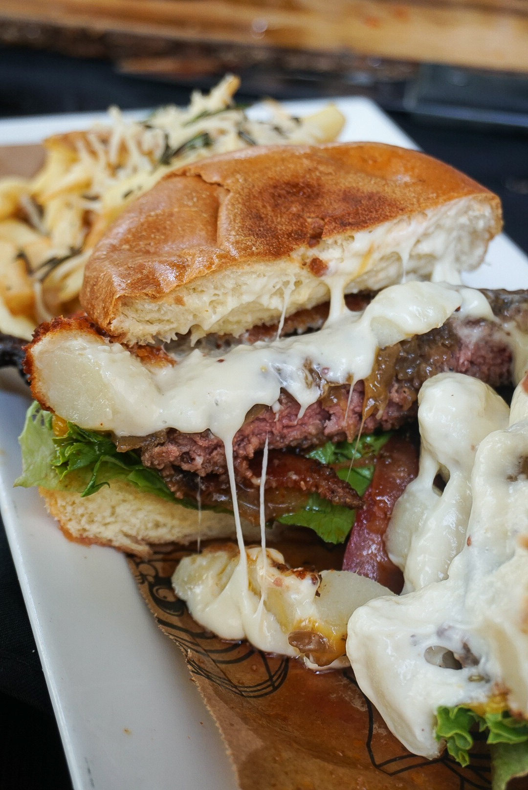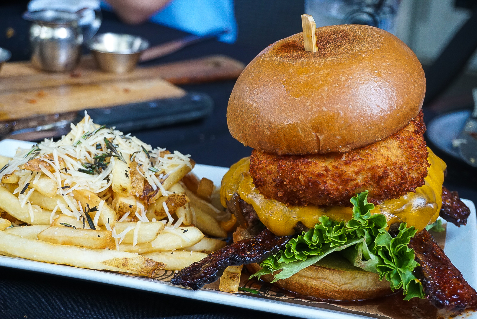 One burger wasn’t enough for the table, so Chef Rob was so kind to send out another and thank you Baby Jesus… allow me to introduce you to the Mac Attack. Note, this bad bad boy is on the Dinner menu and not available for lunch. One hell of a patty topped with fried Gnocchi Mac, Aged Gruyere Cheese, & “Dorito Dust” and all sorts of fixins you can choose from.